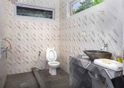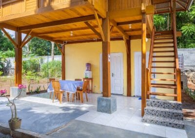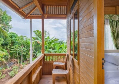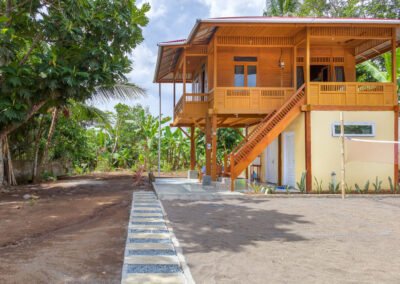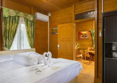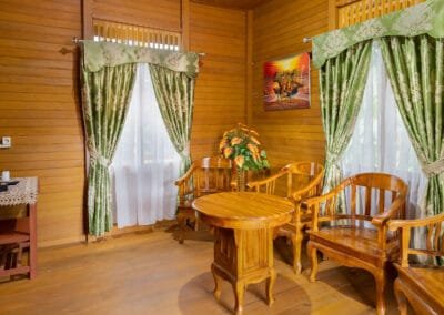 In contrast, the second house is a Minahasa-style wooden house, featuring a beautiful traditional design with two floors. This wooden structure exudes local charm and cultural significance, offering a unique experience for guests looking for something more authentic. The two bedrooms are located upstairs, providing privacy and wonderful views from the higher vantage point. The living room and dining area on the lower floor are cozy and inviting, with a touch of local artistry in the decor. This house is also fully equipped with modern conveniences, including a private bathroom, kitchen, and air conditioning, blending tradition with comfort seamlessly.